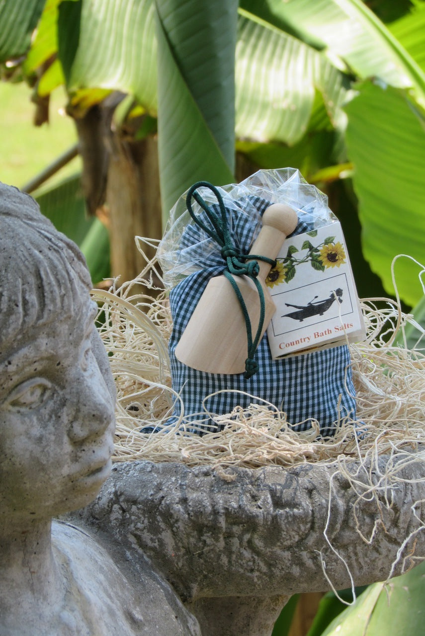 This Country Bath Salt package comes in a gingham check cotton sack, with a wooden scoop. The Epsom Salt soaking solution relieves aches, pains, and any tension in the muscles. The solution includes Lavender and Rosemary Essential Oil. Lavender is most well known for its use in aromatherapy, it is an antiseptic, it is used in the treatment of sunburn and muscle joint pain. It has also been known to aid in relaxation, reduce anxiety, and relieve stress and tension headaches. Rosemary has long been used in the treatment of respiratory problems. The vapors give relief to throat and sinus and are helpful with allergies.