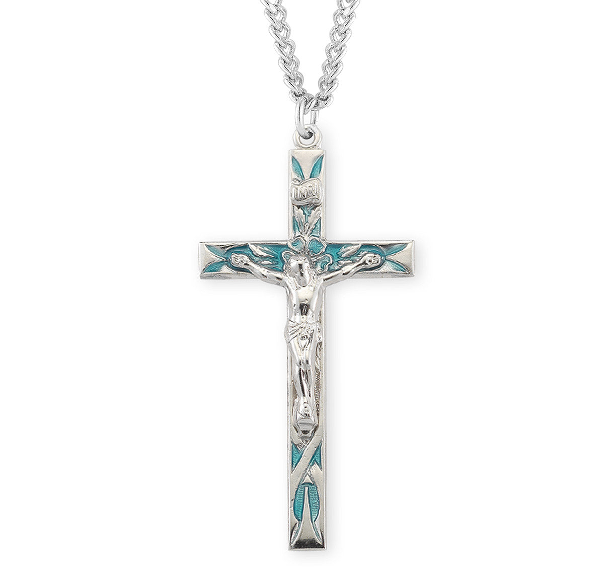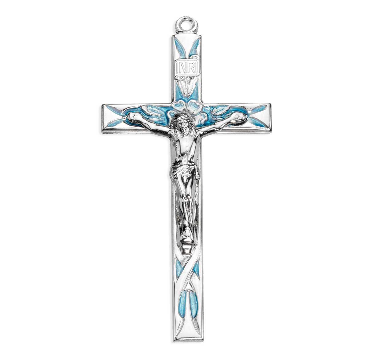 - High polished blue enameled crucifix pendant.
