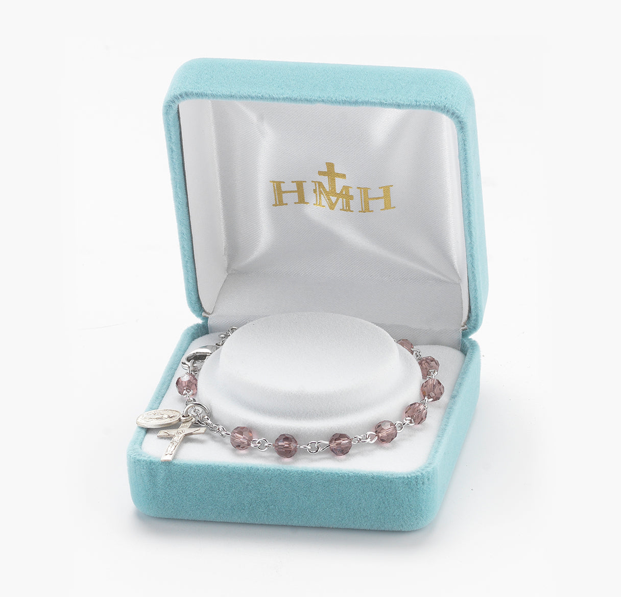 This elegant Light Amethyst Crystal Rosary Bracelet features beautiful 5mm round faceted crystal beads in a soft amethyst hue, perfectly complemented by platinum plated brass wire and chain. The bracelet showcases an exclusive Miraculous Medal and crucifix crafted in sterling silver, making it a meaningful piece for daily devotion or a cherished gift.