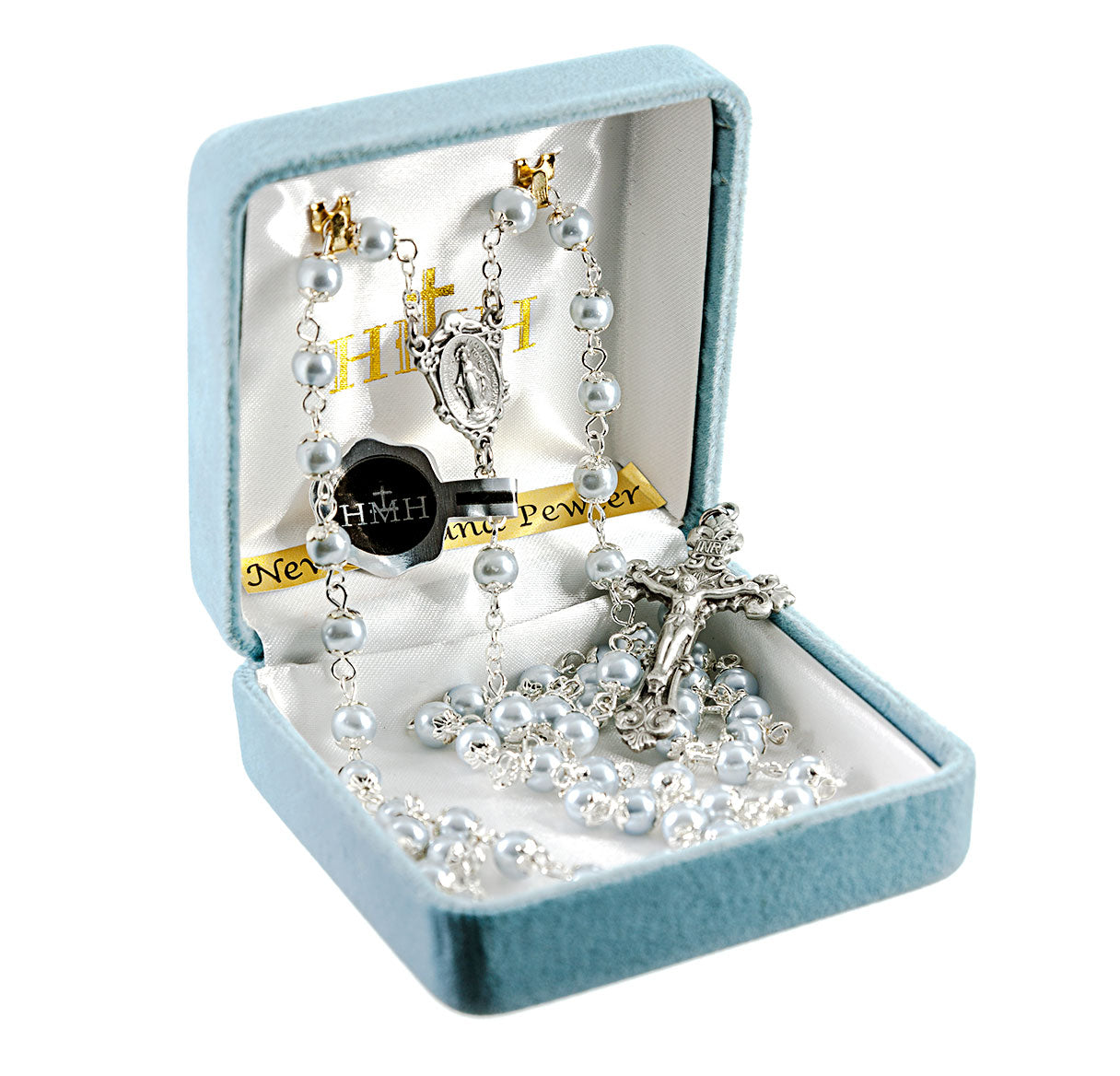 Light Blue Faux Pearl Double Capped New England Pewter Rosary