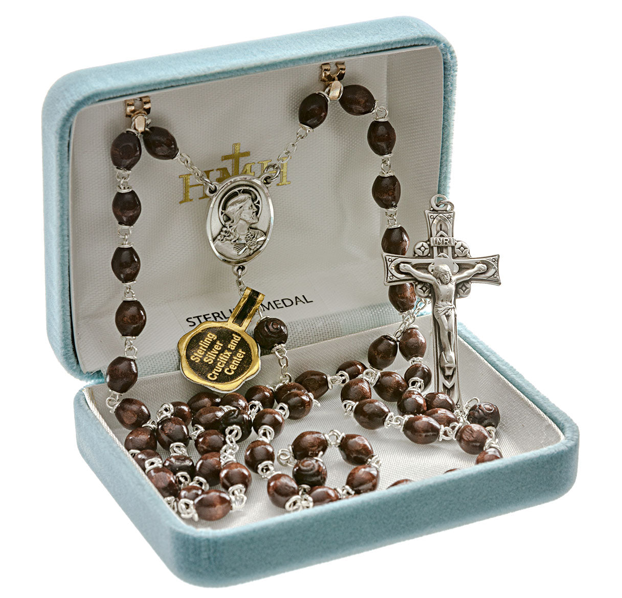 Maroon Round Boxwood Rosary Sterling Crucifix and Centerpiece