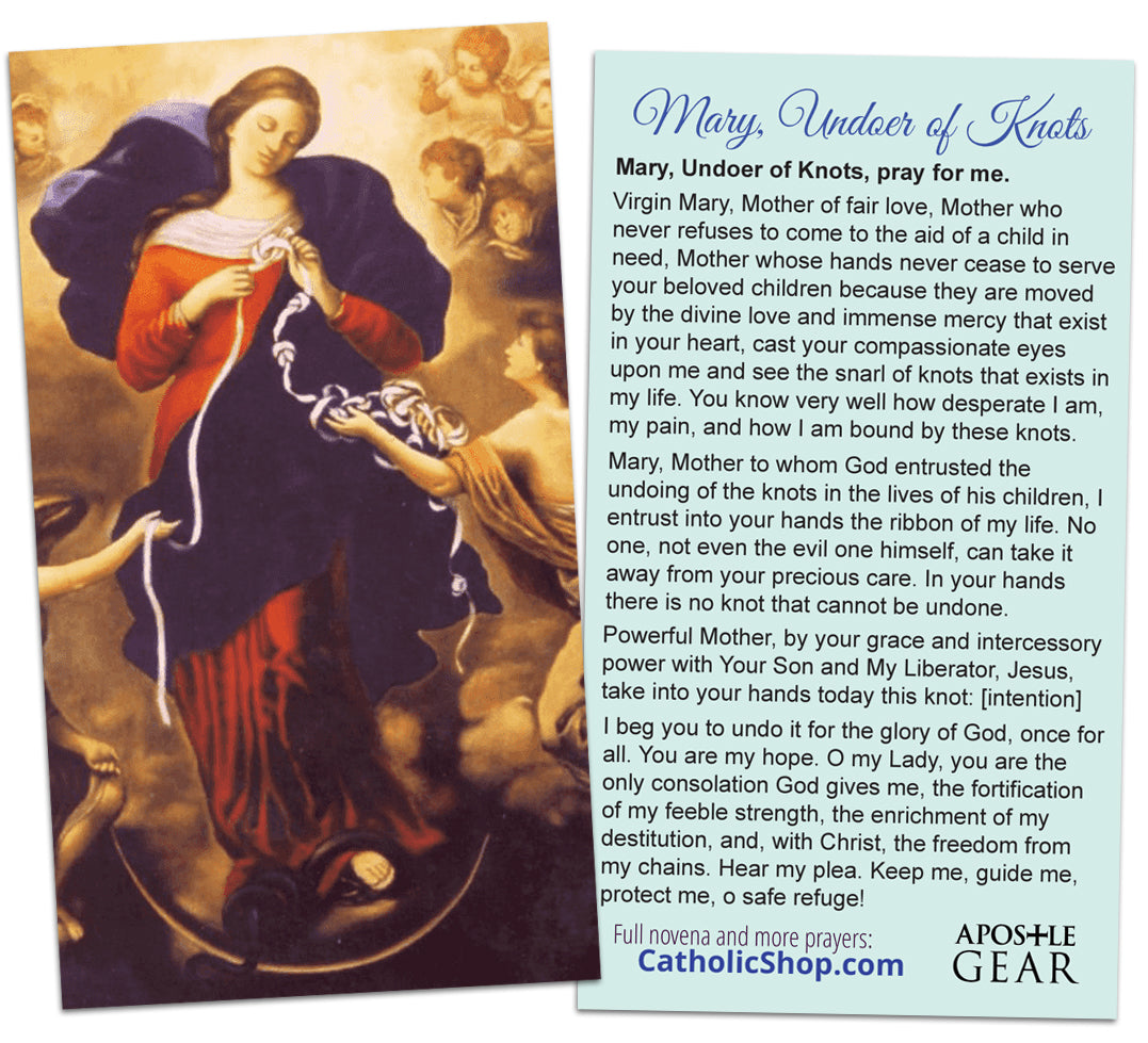 Knots are the struggles in our daily lives that separate us from God. Our Mary, Undoer of Knots Holy Card features the popular devotional prayer on the back..