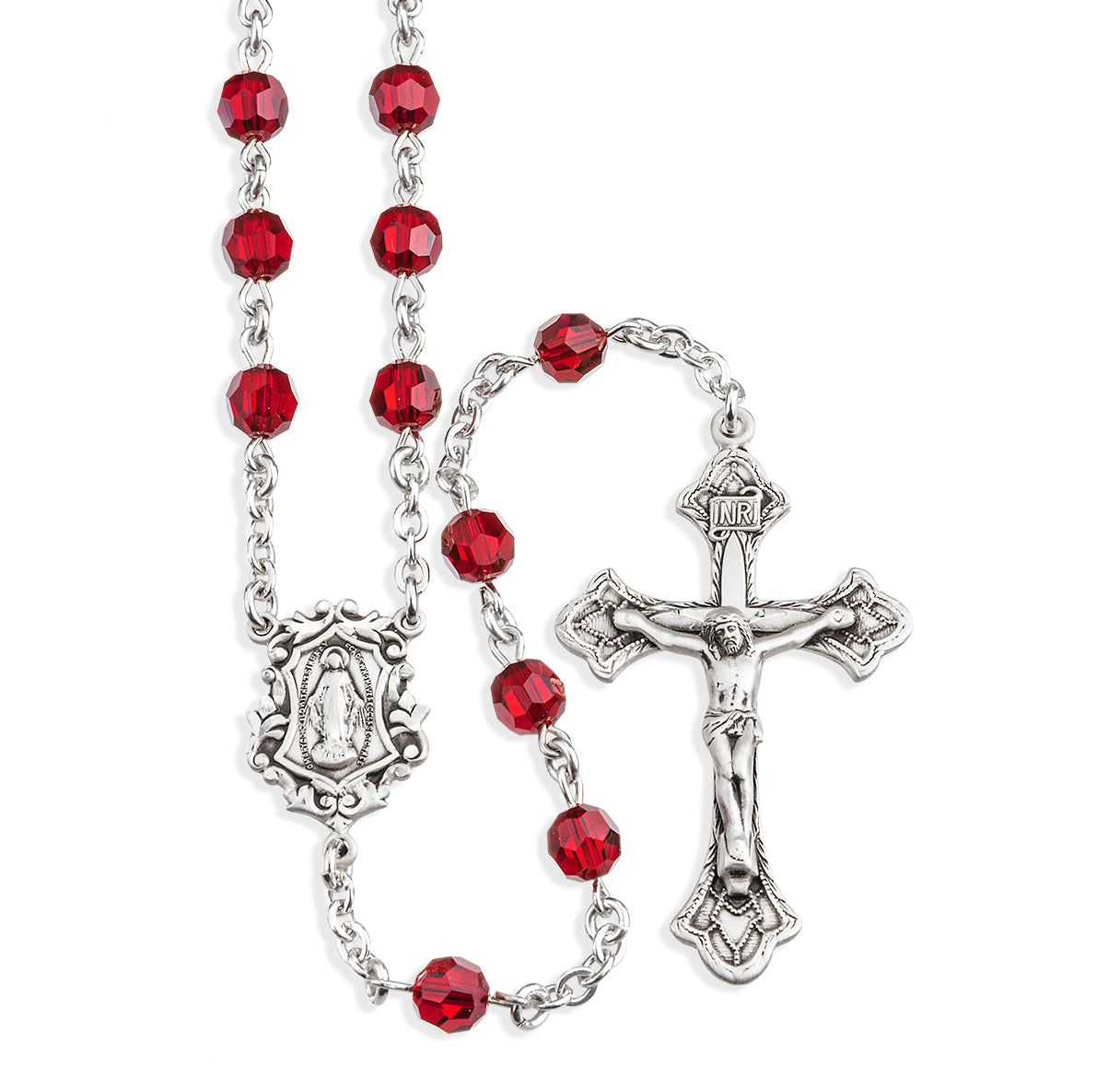 Rosary Sterling Crucifix and Centerpiece with finest Austrian Crystal 6mm Faceted Round Ruby Beads