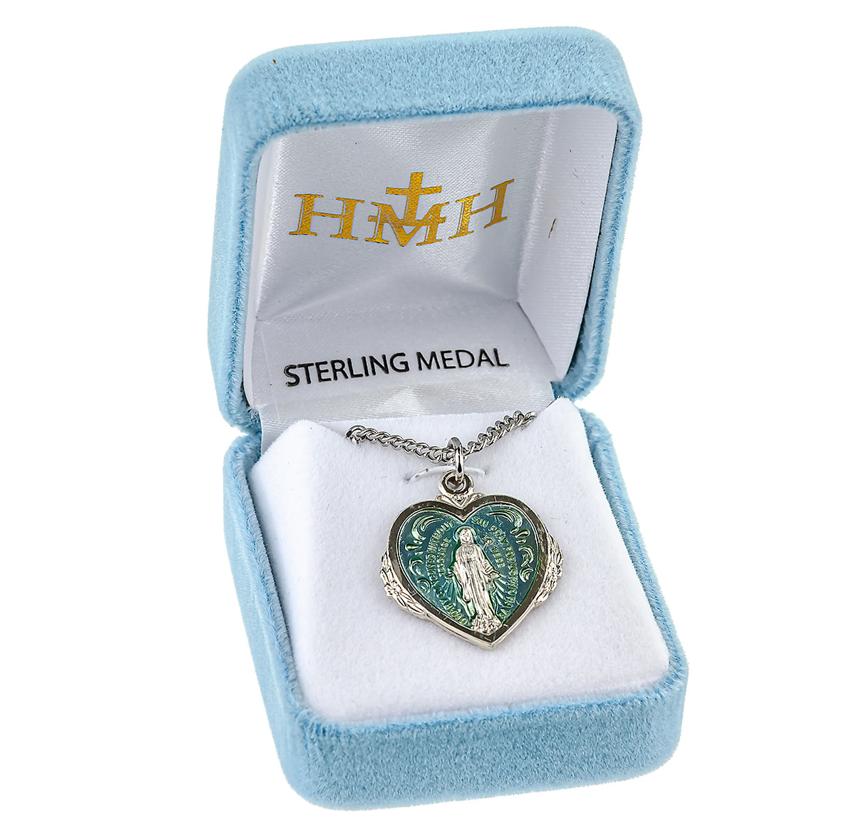 Sterling Silver Blue Enameled Heart Shape Miraculous Medal