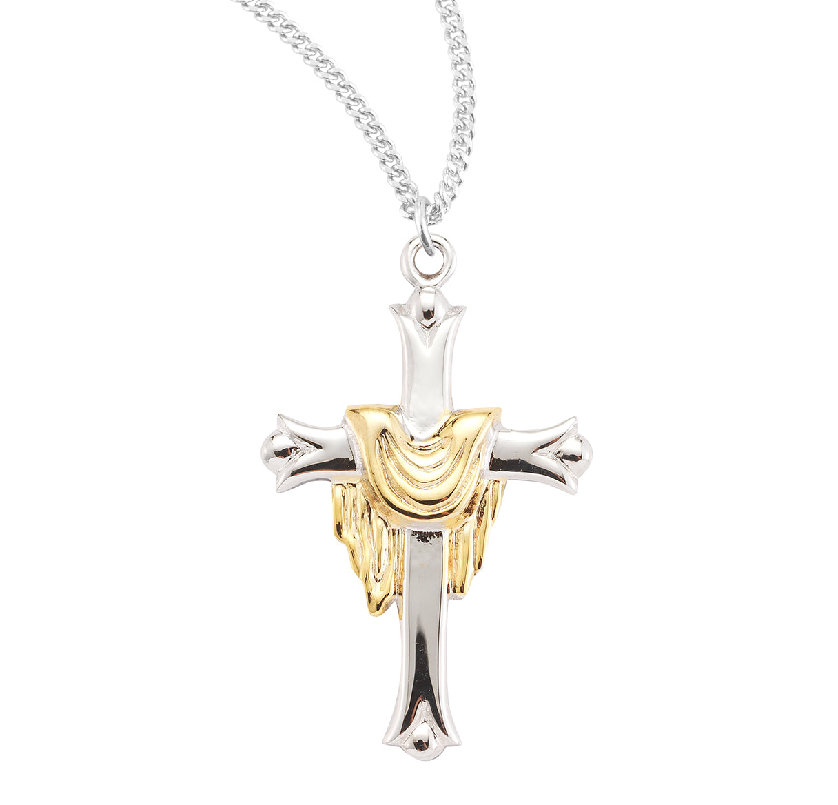 - Two-tone Cross pendant with a robe draped over it.