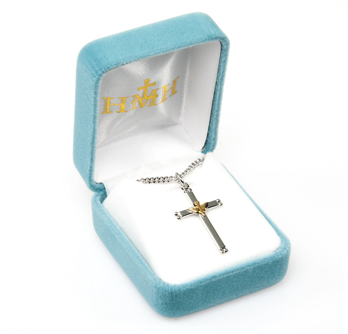 - Two-tone cross with Holy Spirit pendant.