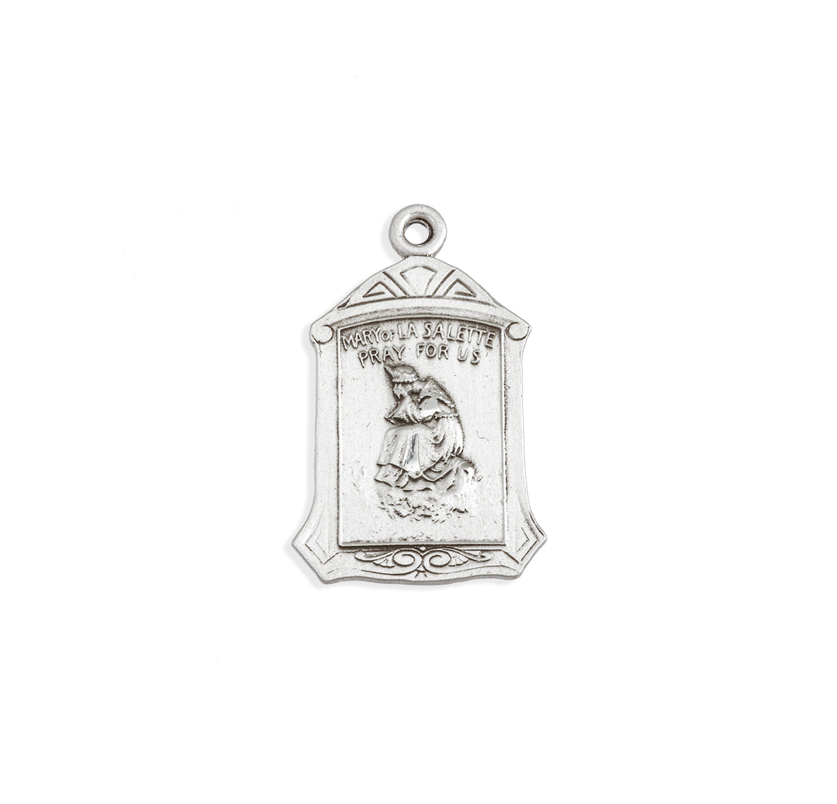 This beautiful Sterling Silver Our Lady of La Salette Medal honors the 1846 apparition of the Blessed Virgin Mary to two shepherd children in the French Alps. Expertly crafted from solid .925 sterling silver, this die-struck medal is hand-polished and engraved by skilled New England silversmiths. The elegant arch-shaped design measures 1" x 0.6" and comes with an 18" surgical stainless steel fine curb chain.