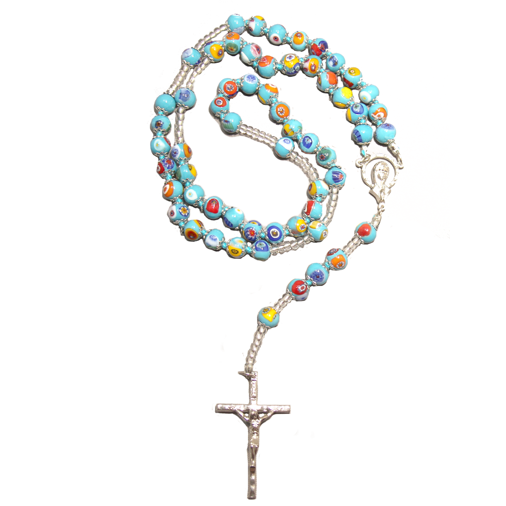 This exquisite handcrafted rosary features genuine Murano glass beads in luminous turquoise, each individually hand-knotted for durability and elegant drape. Crafted by skilled Italian artisans using centuries-old glassmaking techniques, every bead showcases the distinctive mosaic millefiori pattern that makes Murano glass treasured worldwide. The substantial beads catch and reflect light beautifully, making each decade a meditation in color and craftsmanship.