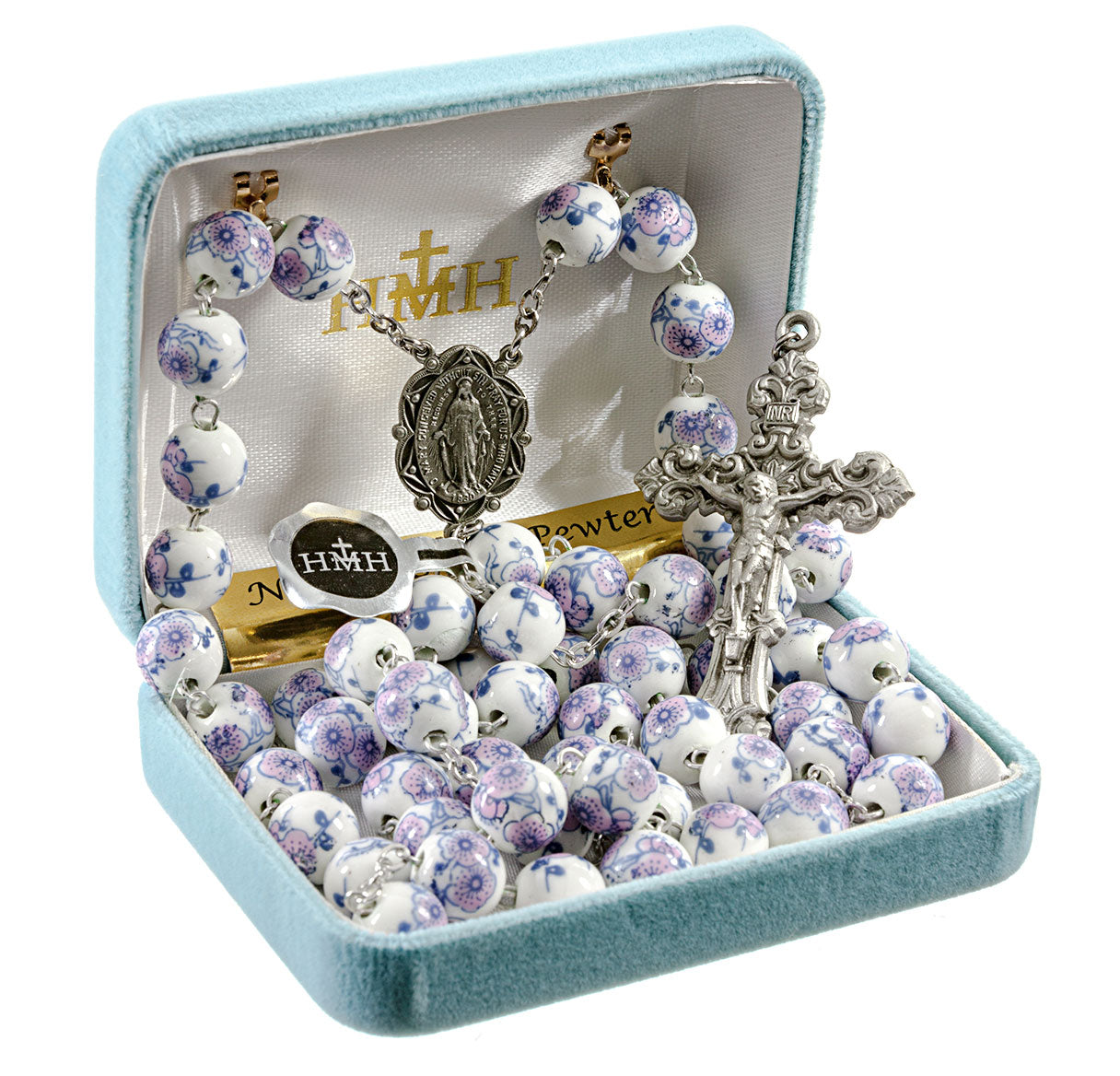 White and Violet Glass Flower Bead New England Pewter Rosary